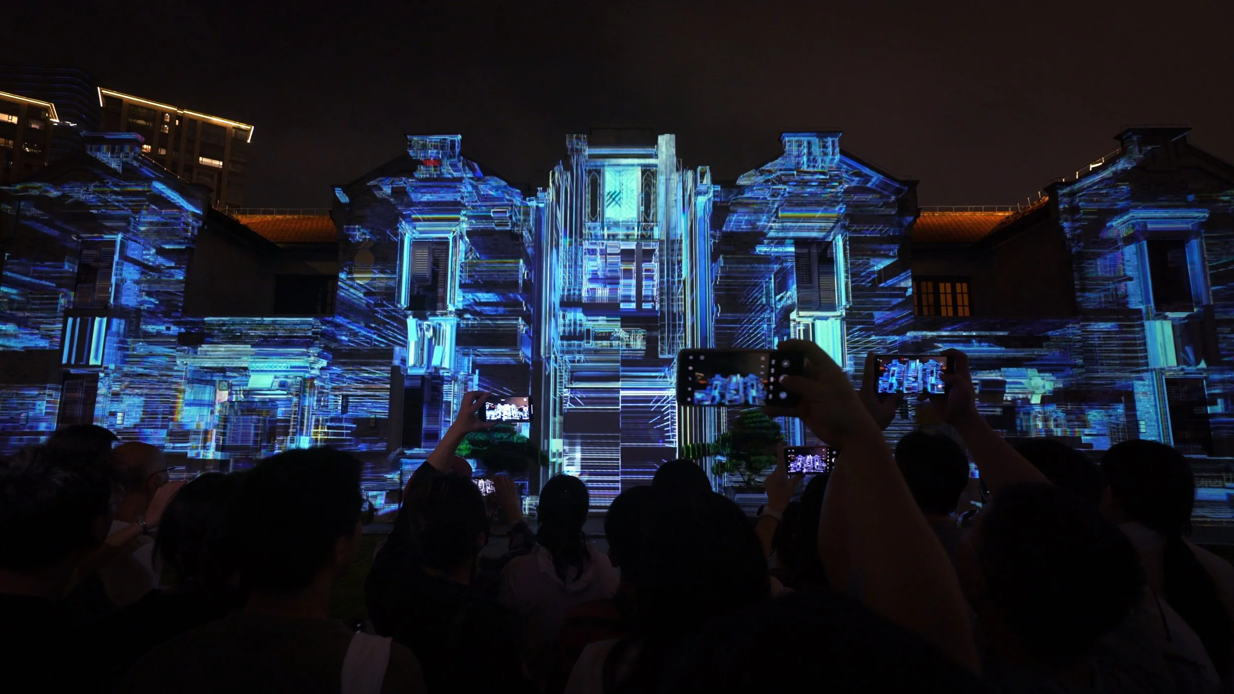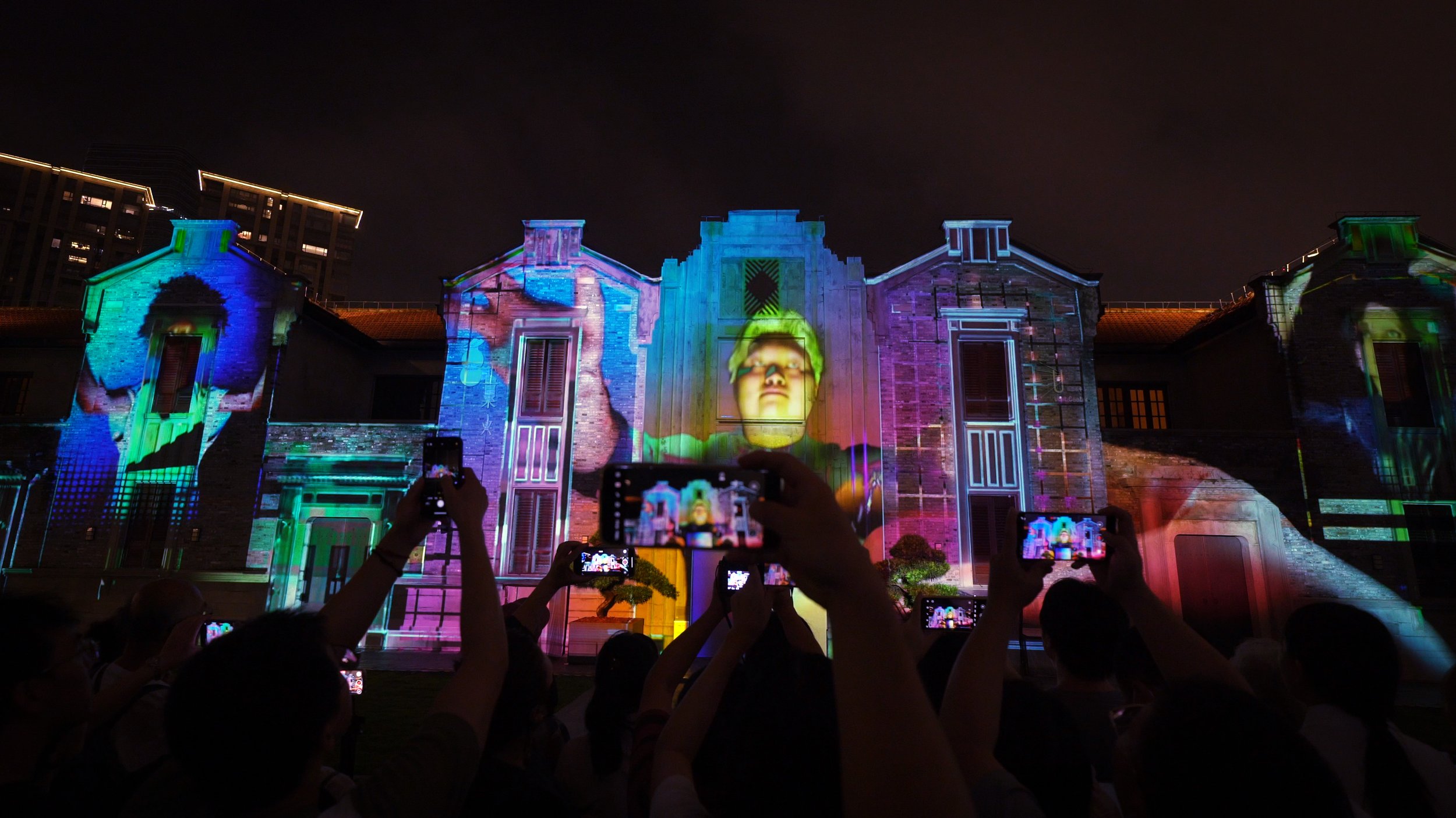 Anticipating the scale of people compared to the projection and the behaviour of the audience, the mapping show expands beyond the surface of the building.
